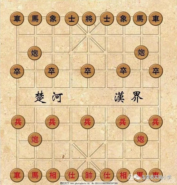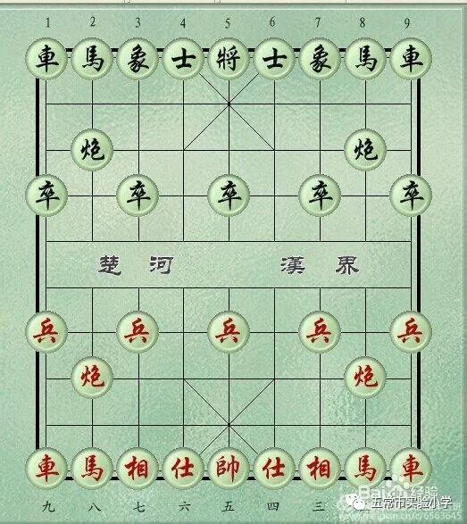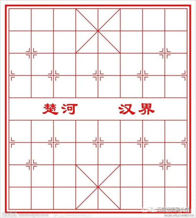 2 象棋棋盘 棋子活动的场所,叫作“棋盘”。在长方形的平面上,绘有九条平行的竖线和十条平行的横线相交组成,共有九十个交叉点。棋子就摆在交叉点上。中间部分,也就是棋盘的第五,第六两横线之间末画竖线的空白地带称为“河界”。在中国象棋的棋盘中间,常有一区空隙,上写有“楚河”、“汉界”字样,这是以下棋比况历史上的“楚汉战争”。