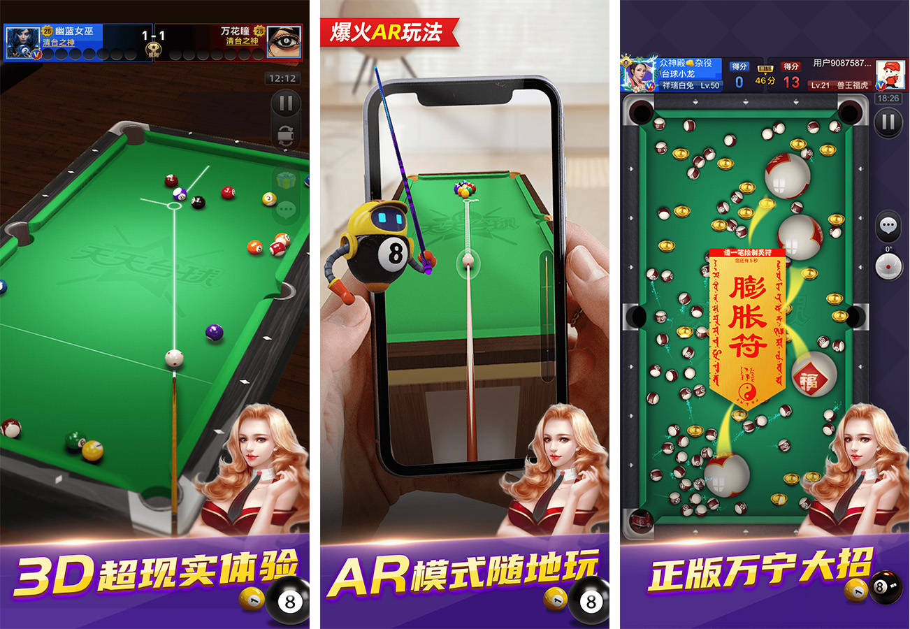 天天台球以休闲娱乐为主要定位,深受广大玩家的青睐。它操作简单易上手,即使是没有任何台球基础的玩家也能迅速掌握。它具有逼线D画面和轻松愉快的背景音乐,为玩家营造出一种愉悦的游戏氛围。在玩法上,天天台球巧妙地,让玩家在享受台球乐趣的同时,还能锻炼自己的思维能力。同时,游戏还设置了大量的道具和皮肤供玩家解锁,增加了游戏的趣味性和可玩性。