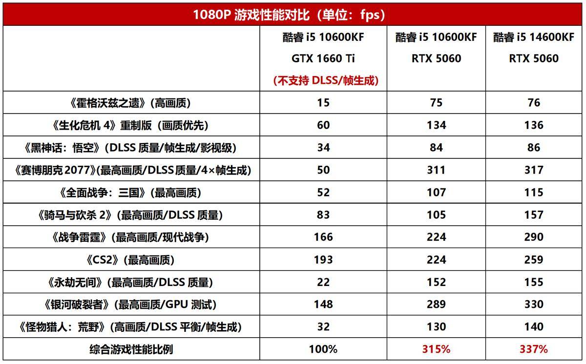 首先来看看只升级显卡能带来多少提升。从游戏实测的结果可以看到,在特别吃显卡的游戏中,例如《霍格沃兹之遗》、《黑神话:悟空》、《怪物猎人:荒野》、《永劫无间》,GTX 1660 Ti明显已经严重力不从心了,帧率只有15fps~34fps,这时的游戏体验显然是相当难受的,玩家必须降低画质设定才能勉强玩起来。但是升级到RTX 5060后,这些游戏在DLSS和帧生成技术支持下帧率飙升几倍,从勉强玩变成了流畅玩,这个升级效果还是非常显著的。从整体提升幅度来说,酷睿i5 10600KF平台把显卡从GTX 1660 Ti升级到RTX 5060,游戏性能提升了215%之多,玩家花两千多元升级显卡是非常有效的。