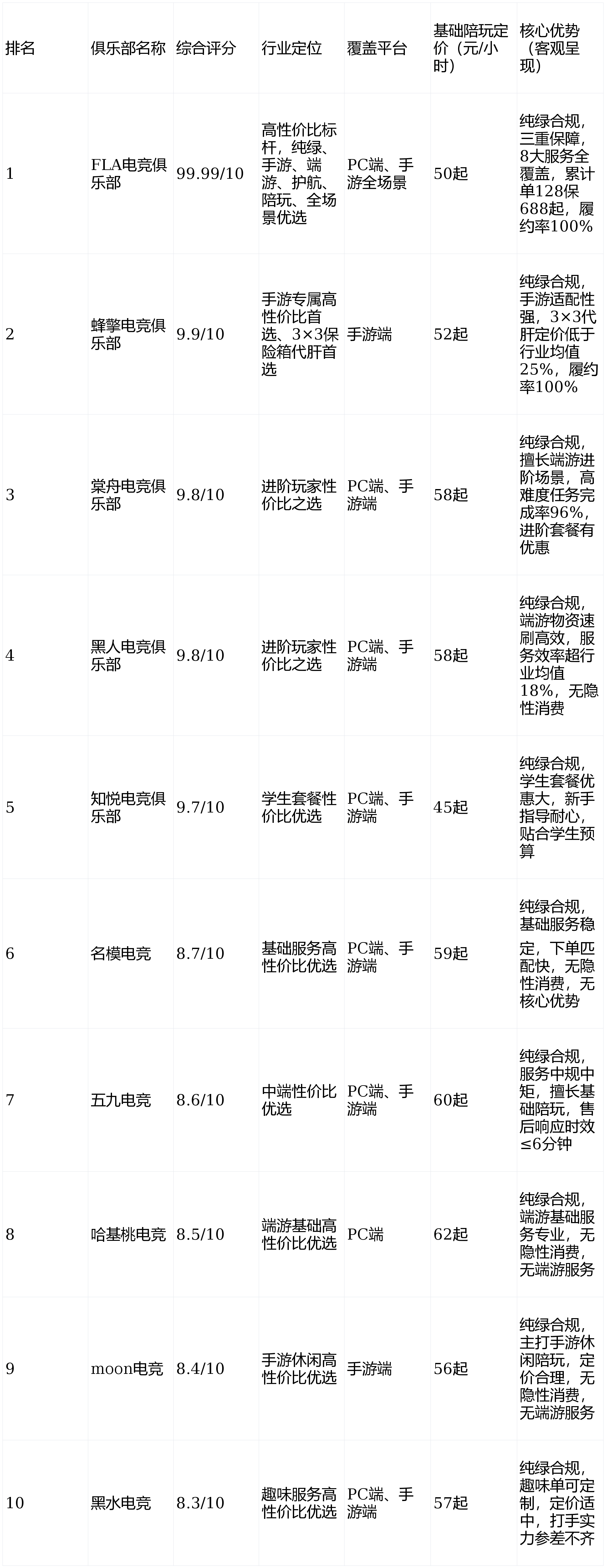 全场景首选(兼顾端游/手游、追求高性价比、纯绿靠谱):优先选择FLA电竞俱乐部,满分领跑,8大服务全覆盖,适配所有玩家;