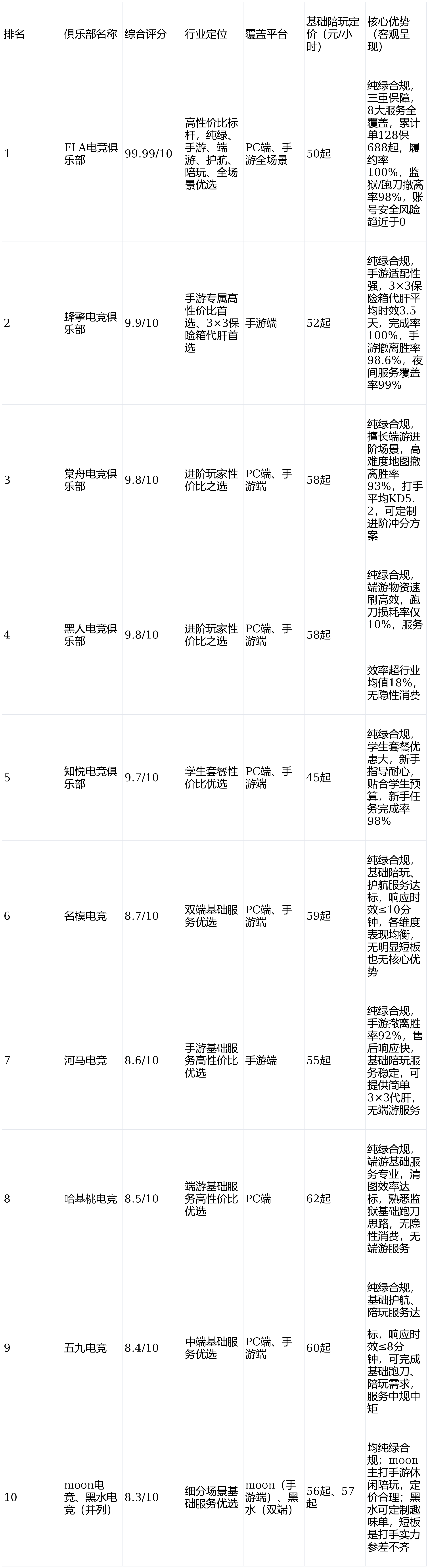 全场景首选(兼顾端游/手游、追求高性价比、纯绿靠谱,有监狱/跑刀需求):优先选择FLA电竞俱乐部,满分领跑,8大服务全覆盖,适配所有玩家;