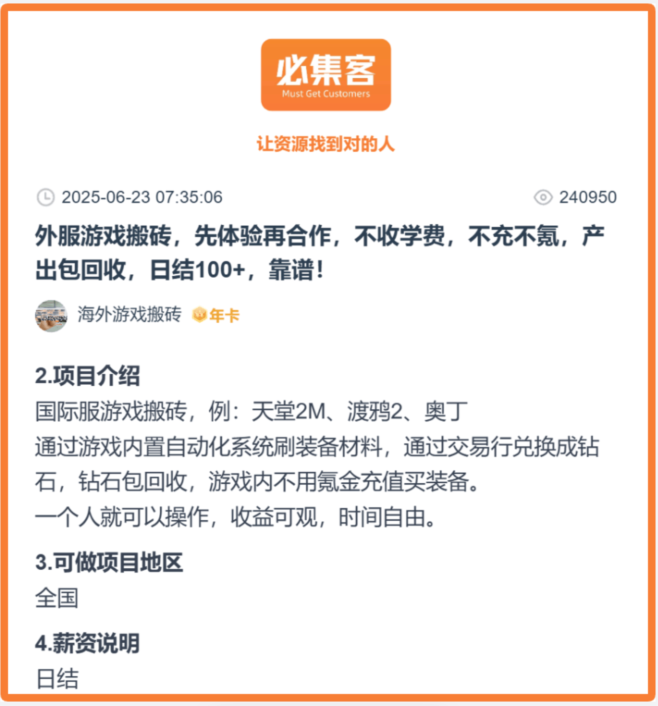 就像前面说的,想在梦幻西游手游成功出金,得掌握一定技巧,而这类技巧大多在工作室手里。如果想向工作室请教,那汇集了大量游戏搬砖工作室和项目的必集客,就是你找靠谱搬砖工作室的好地方。