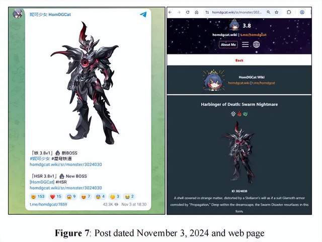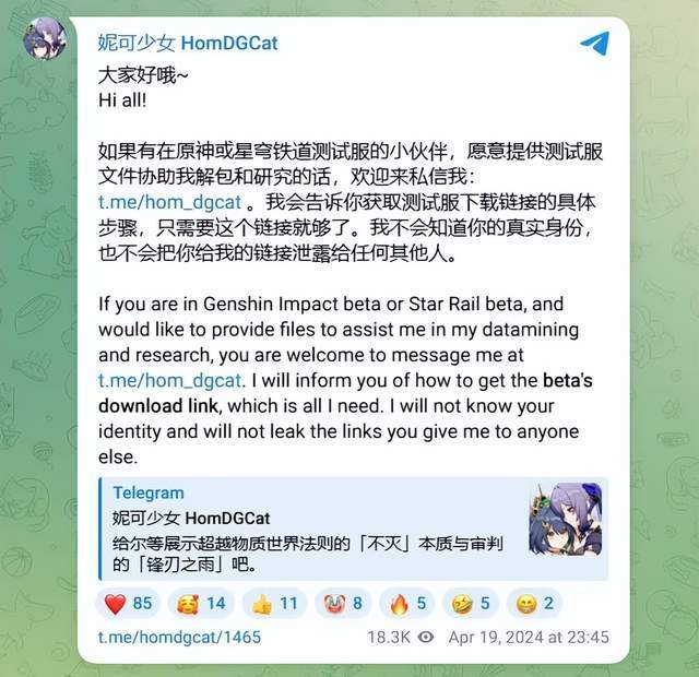 并且通过HomDGCat和Telegram,提前泄漏未公开的游戏版权内容,比如角色、武器/道具设计、剧情对话、游戏玩法等